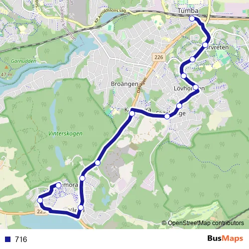 The first stop of the 716 bus route is Bremora and the last stop is Tumba station. 716 is operational during everyday.