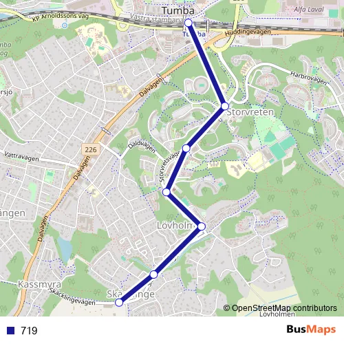 The first stop of the 719 bus route is Tumba station and the last stop is Skäcklinge. 719 is operational during everyday.