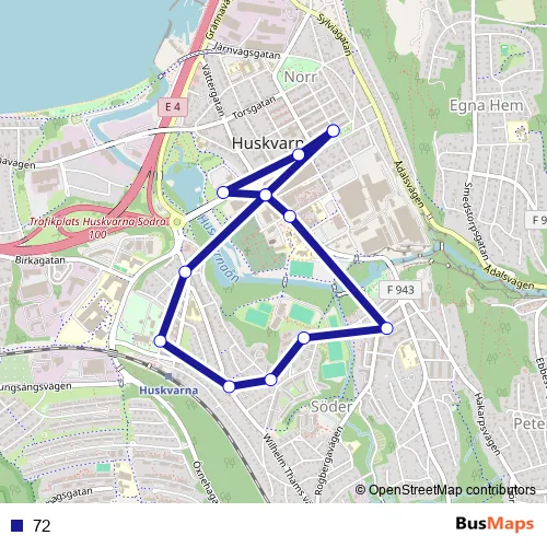The first stop of the 72 bus route is Huskvarna Hörnan and the last stop is Huskvarna Hörnan. 72 is operational during everyday.