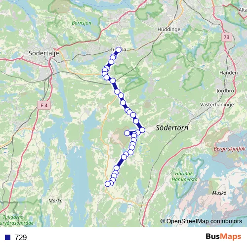 The first stop of the 729 bus route is Tumba station and the last stop is Sorunda Spångbro. 729 is operational during everyday.