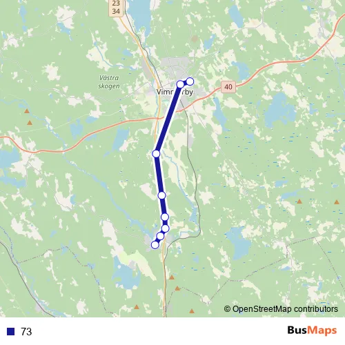 The first stop of the 73 bus route is Vimmerby Vimarskolan and the last stop is Stranden. 73 is operational during on weekdays.