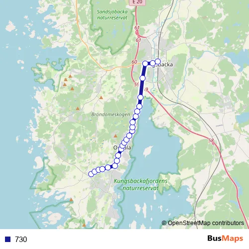 The first stop of the 730 bus route is Iserås skola and the last stop is Kungsbacka station. 730 is operational during on weekdays.