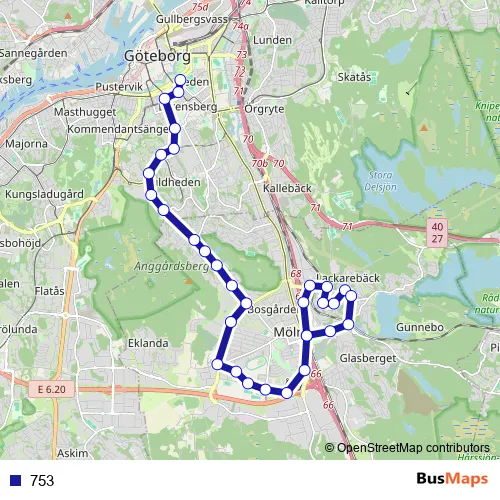 The first stop of the 753 bus route is Göteborg Heden and the last stop is Mölndals bro. 753 is operational during everyday.