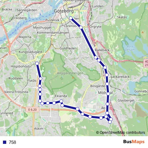 The first stop of the 758 bus route is Göteborg Heden and the last stop is Göteborg Marklandsgatan. 758 is operational during everyday.