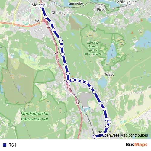 The first stop of the 761 bus route is Mölndals bro and the last stop is Lindome station. 761 is operational during everyday.