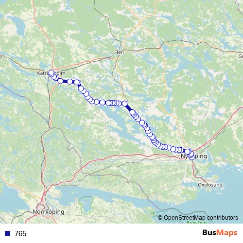 The first stop of the 765 bus route is Nyköping busstation and the last stop is Katrineholm Centralstation. 765 is operational during everyday.