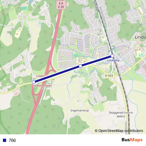 The first stop of the 766 bus route is Lindome station and the last stop is Västra Fageredsvägen. 766 is operational during on weekdays.