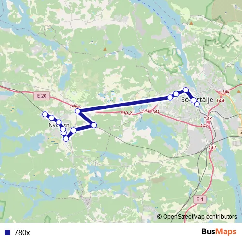 The first stop of the 780x bus route is Södertälje centrum station and the last stop is Nykvarn Bärvägen. 780x is operational during everyday.