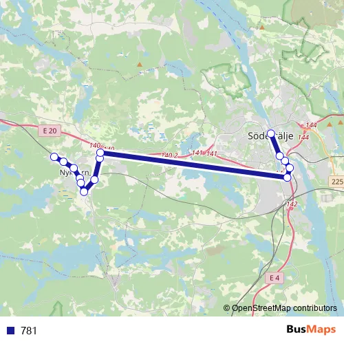 The first stop of the 781 bus route is Nykvarn Bärvägen and the last stop is Köpmangatan. 781 is operational during on weekdays.