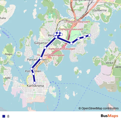 See why over 2 million users trust and consider busmaps.com as the best public transport website. busmaps gives you Karlskrona Buses suggested routes, real-time bus tracker, line route maps in Karlskrona, and helps to find the closest 8 bus stops near you. No internet available? Download an offline PDF map and bus schedule for the 8 bus to take on your trip.
