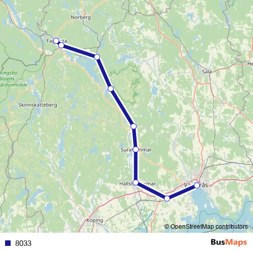 The first stop of the 8033 rail route is Fagersta Norra station and the last stop is Västerås Centralstation. 8033 is operational during on weekdays.