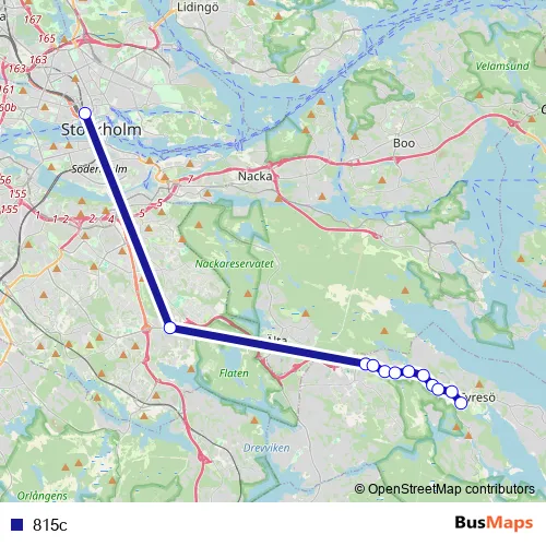 The first stop of the 815c bus route is Stockholm Vattugatan and the last stop is Tyresö kyrka. 815c is operational during on weekdays.