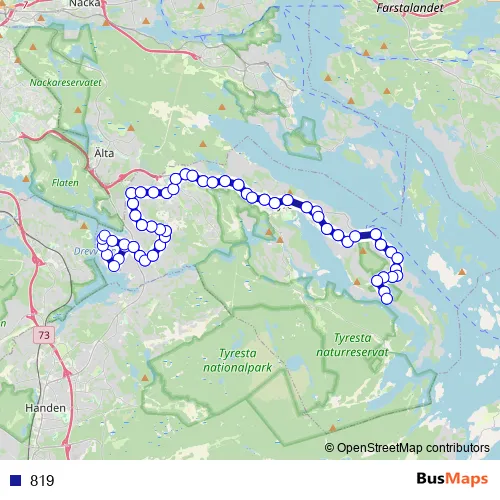 The first stop of the 819 bus route is Tyresö Brevik Mossvägen and the last stop is Tyresö Brevik Mossvägen. 819 is operational during everyday.