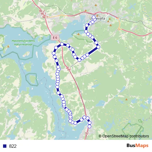 The first stop of the 822 bus route is Ljungskileskolan and the last stop is Uddevalla Kampenhof. 822 is operational during everyday.