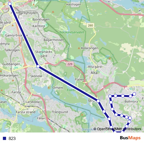 The first stop of the 823 bus route is Tyresö centrum and the last stop is Gullmarsplan T-bana. 823 is operational during on weekdays.