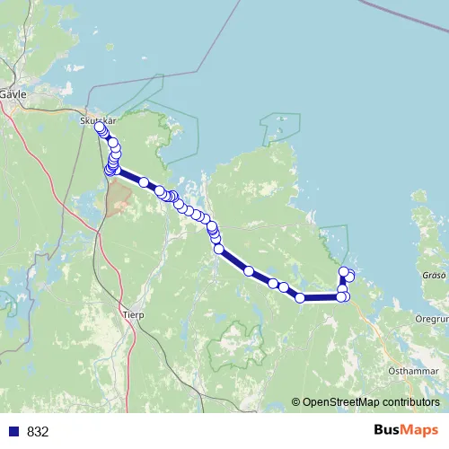 The first stop of the 832 bus route is Forsmarks kraftverk 1-2 and the last stop is Skutskär centrum. 832 is operational during on weekdays.