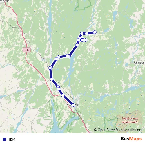 The first stop of the 834 bus route is Hedekas and the last stop is Munkedal station. 834 is operational during on weekdays.