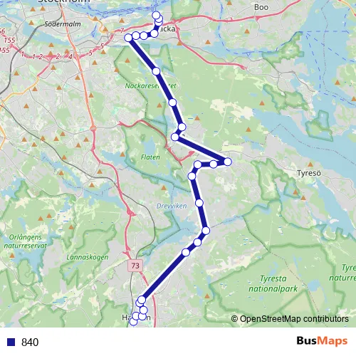 The first stop of the 840 bus route is Handen Rudsjöterrassen and the last stop is Nacka Strand. 840 is operational during everyday.