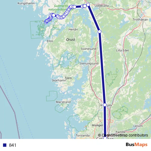 The first stop of the 841 bus route is Lysekil Havets hus and the last stop is Göteborg Nils Ericsonterminal. 841 is operational during everyday.