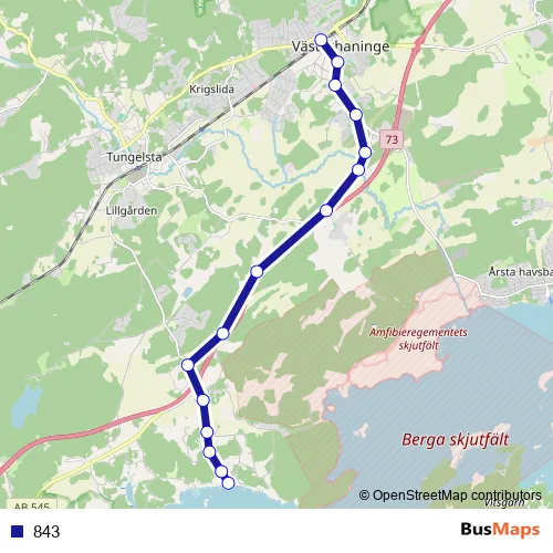 The first stop of the 843 bus route is Söderby brygga and the last stop is Västerhaninge station. 843 is operational during everyday.