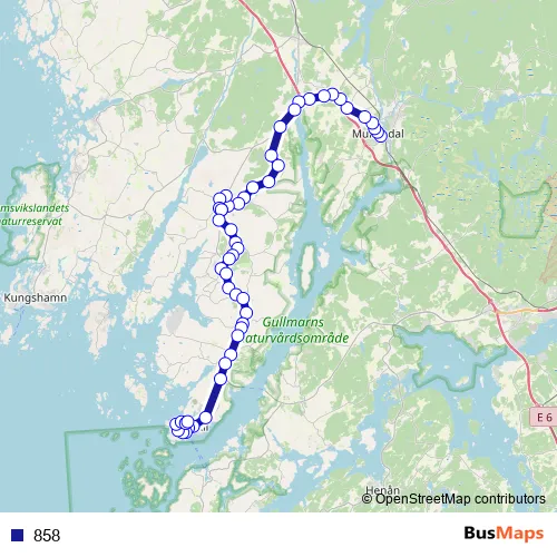 The first stop of the 858 bus route is Munkedal station and the last stop is Lysekil sjukhus. 858 is operational during on weekdays.