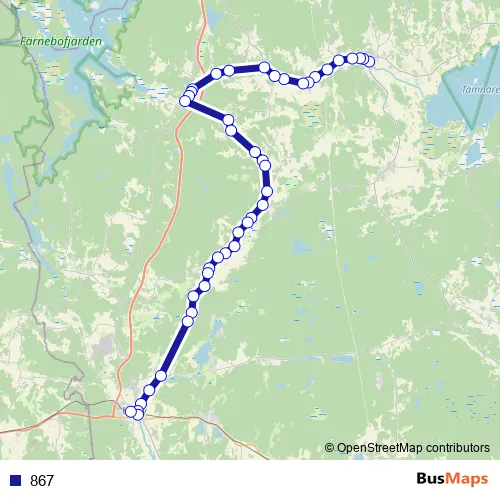 The first stop of the 867 bus route is Östervåla busstation and the last stop is Heby station. 867 is operational during on weekdays.