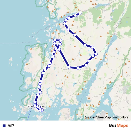 The first stop of the 867 bus route is Brygge and the last stop is Kungshamn busstation. 867 is operational during on weekdays.