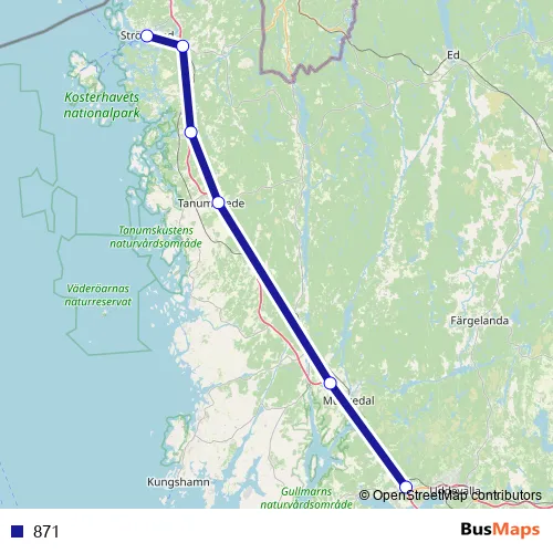The first stop of the 871 bus route is Torp Terminalen Uddevalla and the last stop is Strömstad station. 871 is operational during everyday.