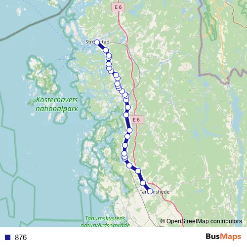 The first stop of the 876 bus route is Tanumshede centrum and the last stop is Strömstad station. 876 is operational during on weekdays.
