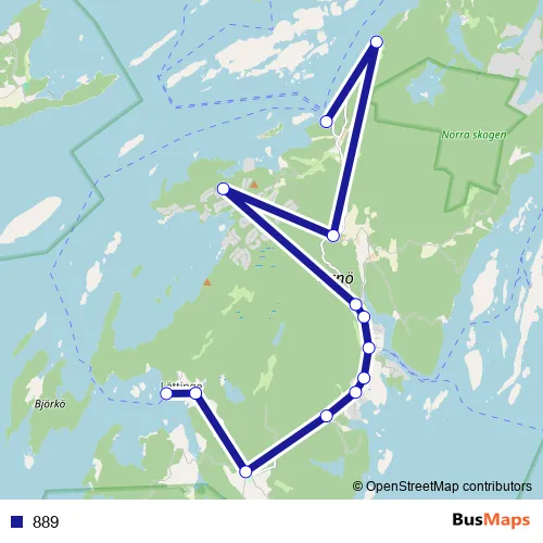 The first stop of the 889 bus route is Hässelmara (Ornö) brygga and the last stop is Lättinge (Ornö) brygga. 889 is operational during everyday.