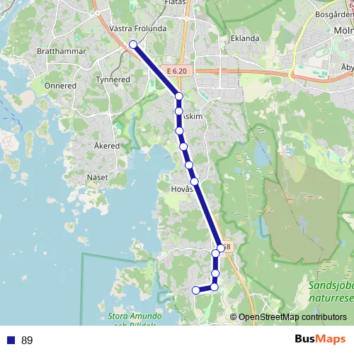 The first stop of the 89 bus route is Frölunda torg and the last stop is Skintebo. 89 is operational during everyday.
