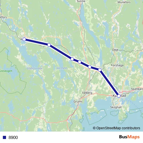 The first stop of the 8900 rail route is Arvika station and the last stop is Karlstad Centralstation. 8900 is operational during on weekdays.