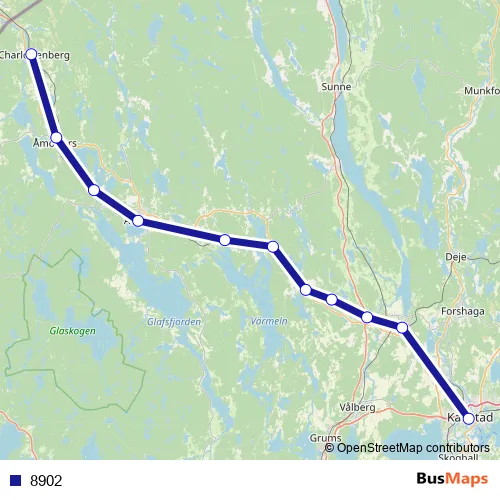 The first stop of the 8902 rail route is Charlottenberg station and the last stop is Karlstad Centralstation. 8902 is operational during on weekdays.