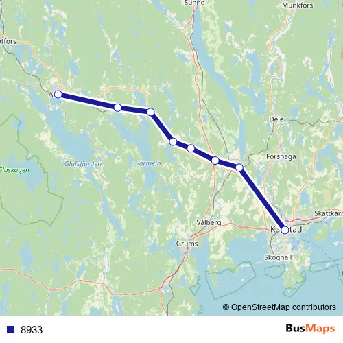The first stop of the 8933 rail route is Karlstad Centralstation and the last stop is Arvika station. 8933 is operational during on weekdays.