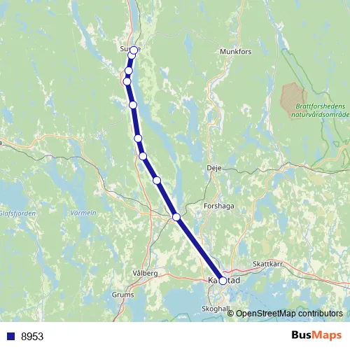The first stop of the 8953 rail route is Karlstad Centralstation and the last stop is Sunne station. 8953 is operational during on weekdays.