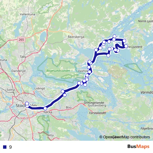 The first stop of the 9 ferry route is Strömkajen and the last stop is Strömkajen. 9 is operational during everyday.