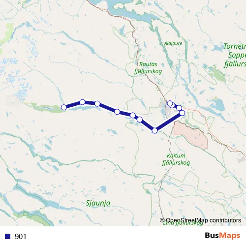 The first stop of the 901 bus route is Kiruna station and the last stop is Nikkaluokta fjällanläggning. 901 is operational during everyday.