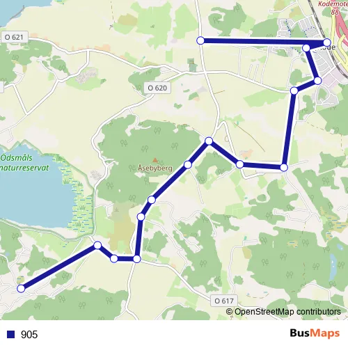 The first stop of the 905 bus route is Ödsmåls mosse byväg and the last stop is Tunge skola. 905 is operational during on weekdays.