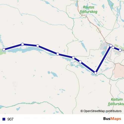 The first stop of the 907 bus route is Kiruna Stadshustorget and the last stop is Nikkaluokta fjällanläggning. 907 is operational during everyday.