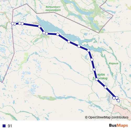 The first stop of the 91 bus route is Kiruna Sjukhus and the last stop is Riksgränsen vändplan. 91 is operational during everyday.