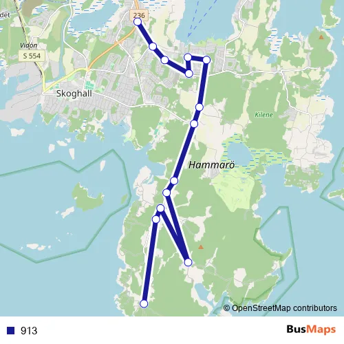 The first stop of the 913 bus route is Takene and the last stop is Jonsbol bytespunkt. 913 is operational during on weekdays.