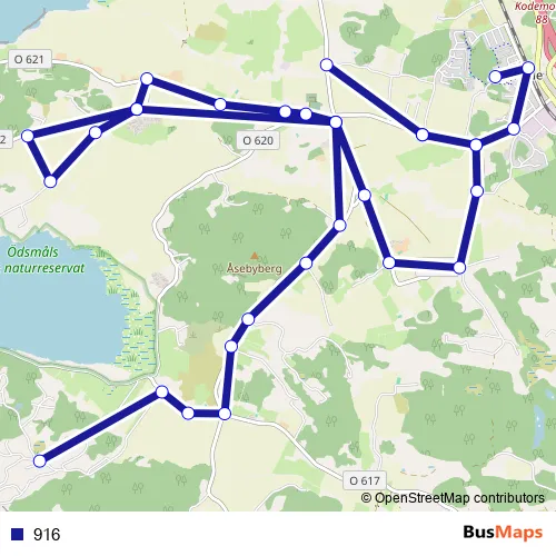 The first stop of the 916 bus route is Kode skola and the last stop is Ödsmåls mosse byväg. 916 is operational during on weekdays.