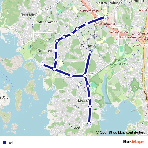 The first stop of the 94 bus route is Frölunda torg and the last stop is Göteborg Näsbovägen. 94 is operational during everyday.