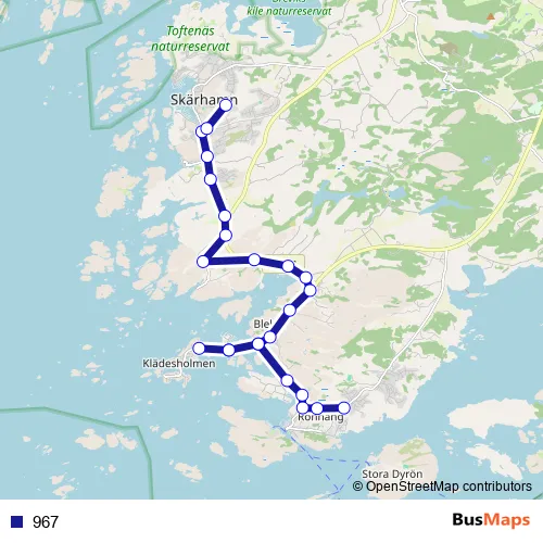 The first stop of the 967 bus route is Rönnängs skola and the last stop is Skärhamns skola. 967 is operational during on weekdays.