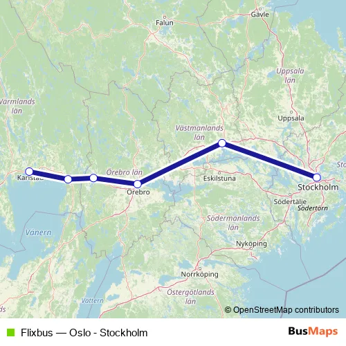 The first stop of the Flixbus bus route is Stockholm, Stockholm Cityterminalen and the last stop is Karlstad. Flixbus (Oslo - Stockholm) is operational during everyday.