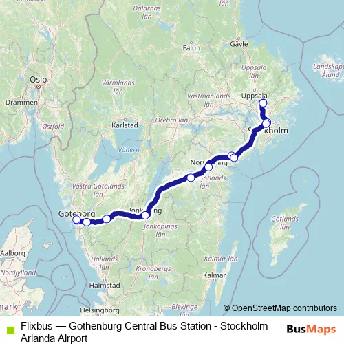 The first stop of the Flixbus bus route is Stockholm Arlanda Airport Terminal 3/2 and the last stop is Gothenburg Central Bus Station. Flixbus (Gothenburg Central Bus Station - Stockholm Arlanda Airport) is operational during everyday.