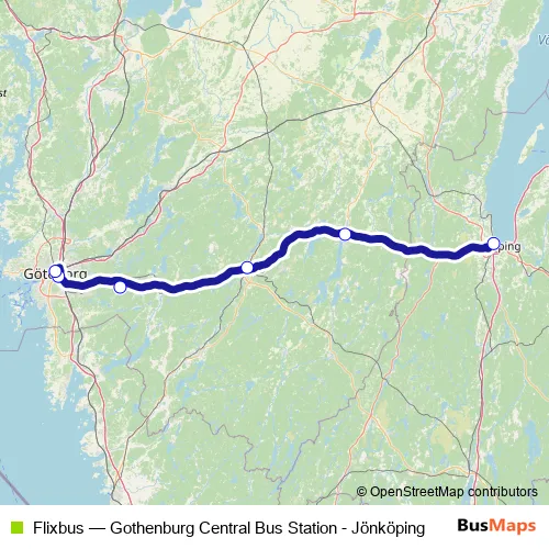 The first stop of the Flixbus bus route is Jönköping Bus Station and the last stop is Gothenburg Central Bus Station. Flixbus (Gothenburg Central Bus Station - Jönköping) is operational during everyday.