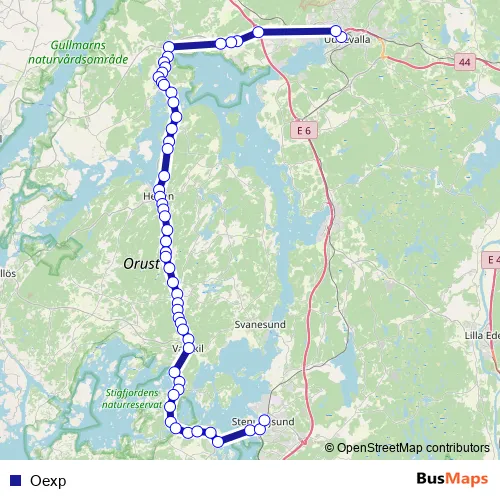 The first stop of the Oexp bus route is Uddevalla Kampenhof and the last stop is Stenungsund station. Oexp is operational during everyday.