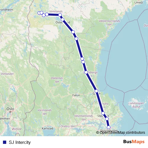The first stop of the SJ Intercity rail route is Duved station and the last stop is Stockholm Centralstation. SJ Intercity is operational during everyday.