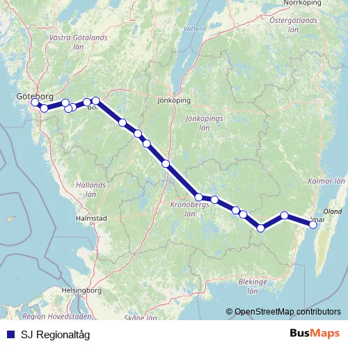 The first stop of the SJ Regionaltåg rail route is Kalmar Centralstation and the last stop is Göteborg Centralstation. SJ Regionaltåg (SJ Regionaltåg) is operational during everyday.